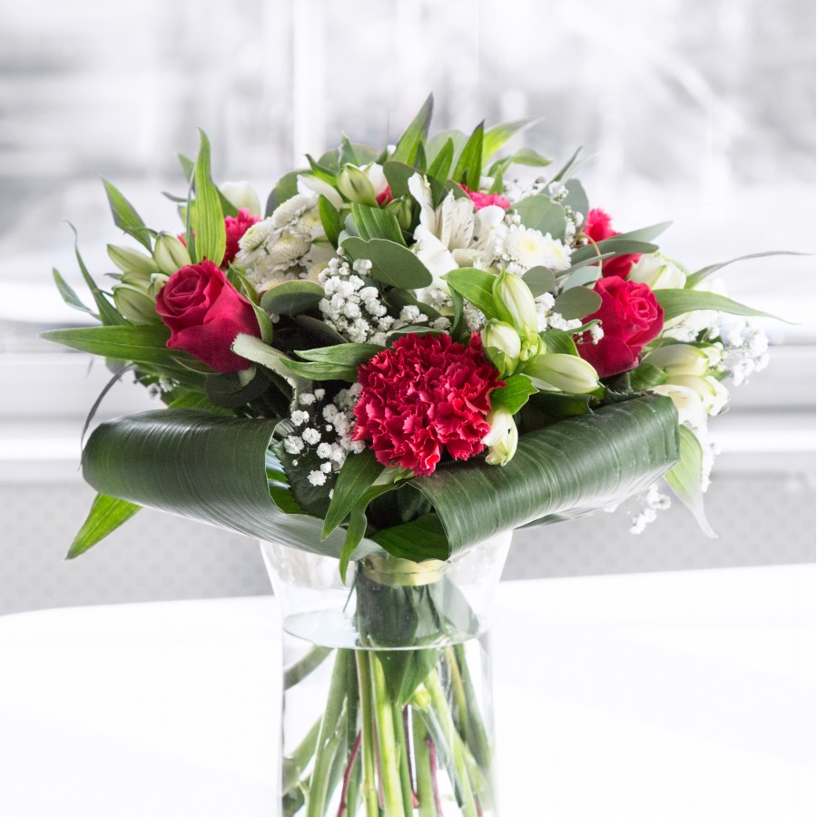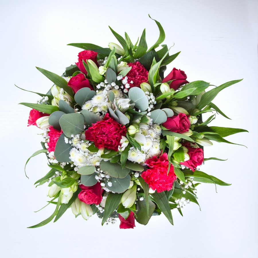 Our radiant bouquet showcases luxurious red roses paired with sweet white chrysanthemums and gypsophila, arranged beautifully with white alstroemeria and aspidistra leaves. This unique combination highlights the beauty and elegance of each flower.